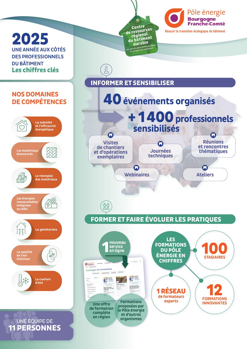 L’année a été marquée par le lancement d’un nouveau service en ligne : un catalogue régional de formation dédié au bâtiment durable et à la transition énergétique. Cet outil centralise l’offre existante en Bourgogne-Franche-Comté afin de faciliter l’accès des professionnels à des formations adaptées à leurs besoins.