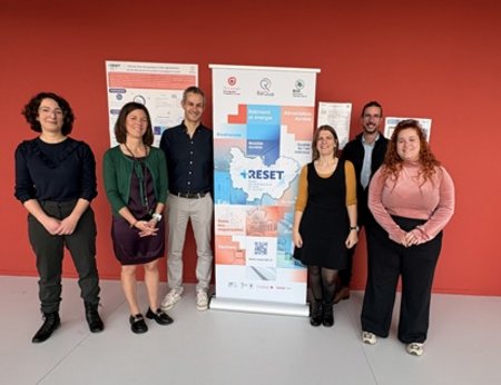 Photo de l'équipe RESET (de gauche à droite) : Anastasia Fragnaud (Bio BFC), Virginie Démésy (Pôle énergie BFC), Antoine Berto (Pôle énergie BFC), Lucie Guergen (RéQua), David Boileau (Pôle énergie BFC), Inès Bourotte-Laroche (RéQua).