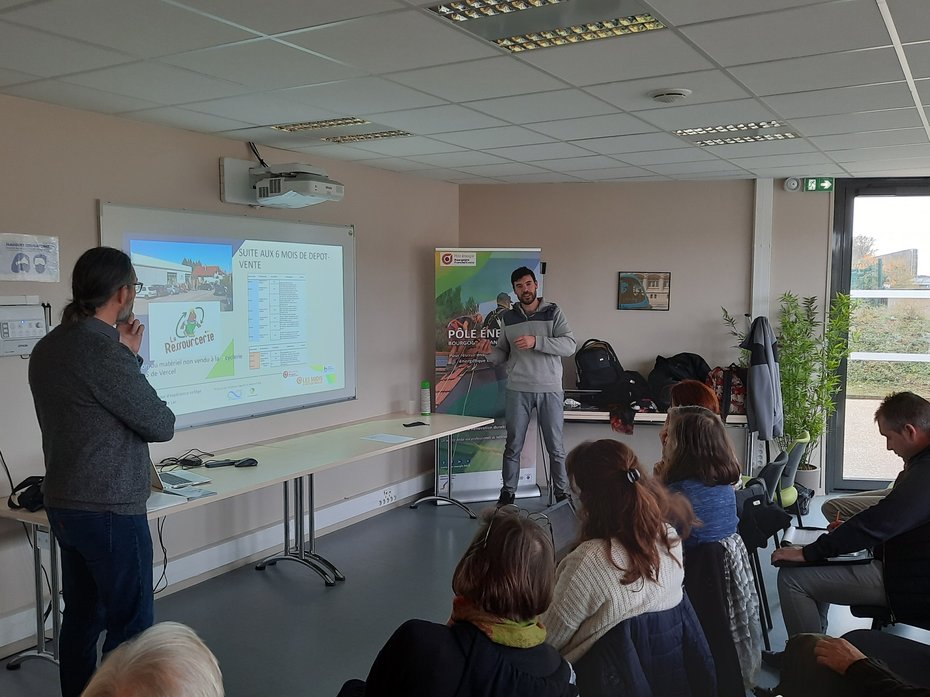 C'est autour de ces questions que deux "pionniers" du réemploi : Maxime JOLY d'Alternatinnov et Stéphane SAPOLIN de Low Carbon Design, deux professionnels qui pratiquent le réemploi au quotidien, ont apporté des éléments de réponses aux professionnels présents lors de ce MIDI du bâtiment innovant.