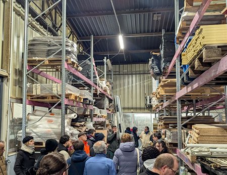 Lors de la visite, Maxime JOLY, fondateur et gérant d'Alternatinnov a présenté sa matériauthèque de 1200 m², où une large gamme de matériaux, bois, métaux, menuiseries, isolants et éléments décoratifs est soigneusement valorisée. Ces ressources, autrefois considérées comme des déchets, deviennent ici des solutions pour les projets de construction et de rénovation.