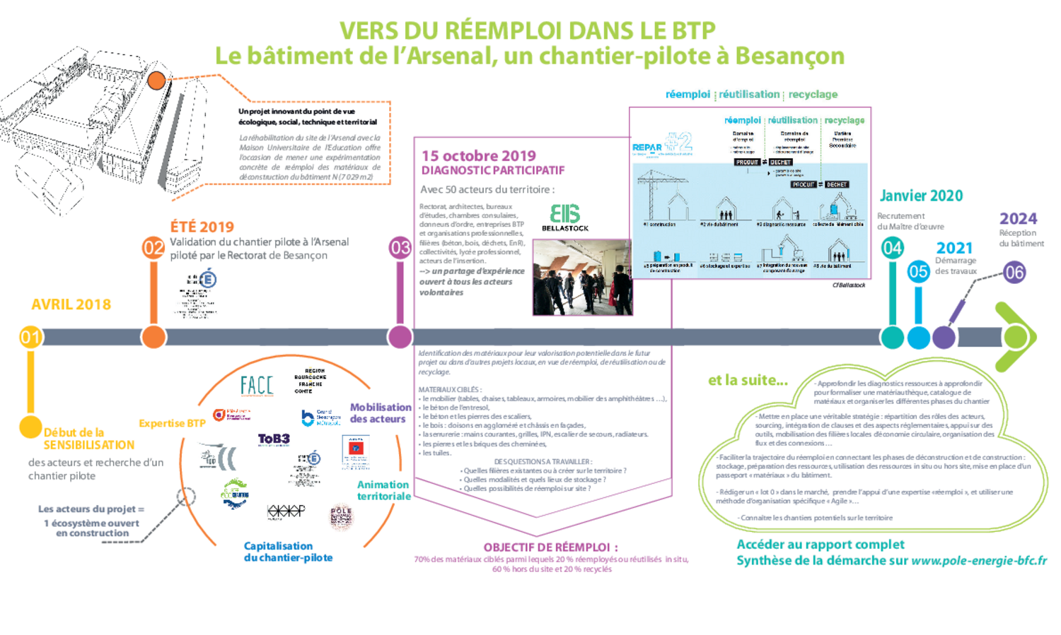 Dans le cadre d’une démarche partenariale, le groupe de travail a cherché un chantier pilote, permettant d’expérimenter sur le territoire, l’économie circulaire au sens large, et le réemploi en particulier. C'est le projet de réhabilitation du bâtiment N du site de l’Arsenal, dont le maître d’ouvrage est le Rectorat de Besançon, qui a ainsi été retenu.