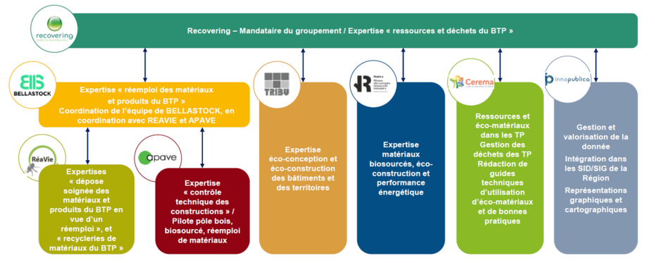 Le lauréat de cet appel d’offres est un groupement de prestataires : le mandataire Recovering travaille en collaboration avec ses partenaires Bellastock, le cluster Robin.s, RéaVie, Tribu, le Cerema, Innopublica et l’Apave ; chacun apportant une compétence spécifique, nécessaire à la bonne conduite de la mission.